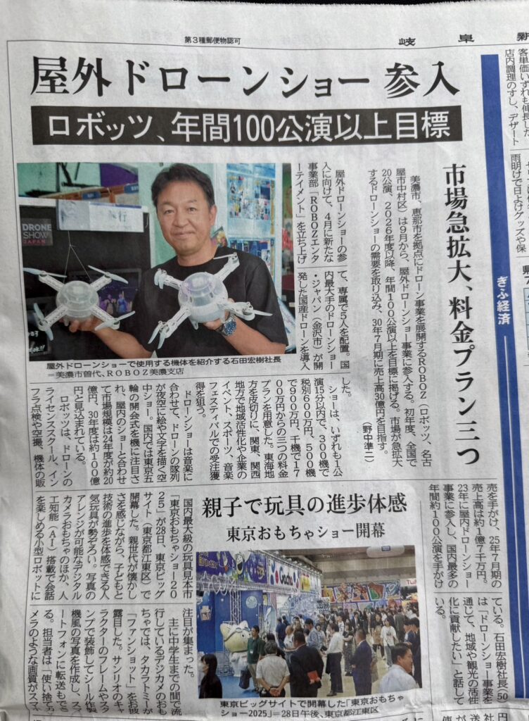 【岐阜新聞掲載】2025年9月より屋外ドローンショー事業に参入します!