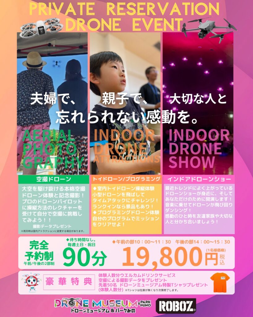 ドローンミュージアム&パークみのでは、土日祝限定で90分の貸し切りドローン体験を開催しています!ご家族やグループだけのプライベートな空間で、最先端のドローン技術を存分にお楽しみいただけます。